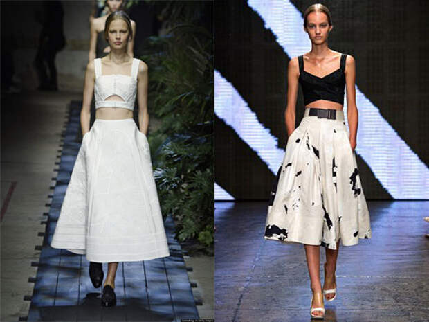 На подиумах они сочетаются с кроп- топом, предельно женственным, но при этом строгим и минималистичным.Прозрачная, пышная или расклешенная юбка в сочетании с провокационно коротким топом — и вы похожи на героиню фильма «Унесенные ветром», и на девушку с фотографии Хельмута Ньютона одновременно.