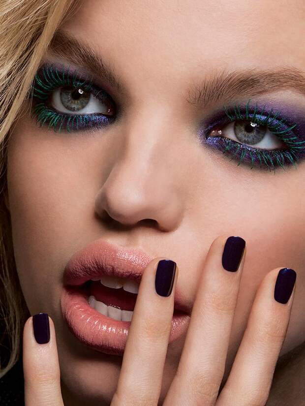 Нанесенные привычным сухим способом тени создадут соблазнительный нежный образ, а влажный способ позволит добиться звонкого интенсивного цвета. Черная тушь уступает место цветным, но не для попадания в тон, а для создания контрастов: изумрудная тушь оттеняет винно- сливовые тени, а медно-розовая – мятные и кобальтовые. Не бойтесь экспериментировать! Эпоха глэма возвращается!