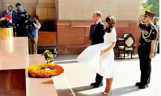 Королевская чета, Кейт Миддлтон и принц Уильям, посетили столицу Индии, где помимо прочих монарших дел возложили венки к вечному огню. У вечного огня сильный ветер поднял юбку герцогини так высоко, что она стала похожа на героиню Мэрилин Монро в известном кадре, где подол девушки поднимает поток воздуха из вентиляционной шахты.